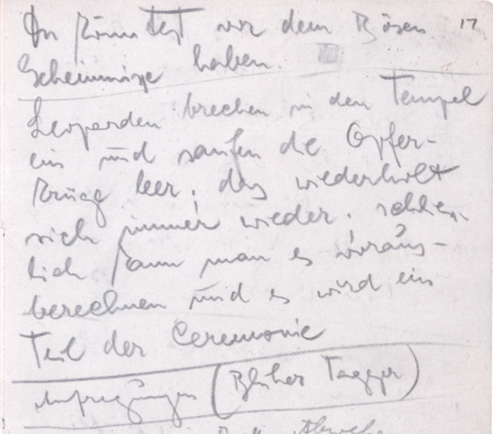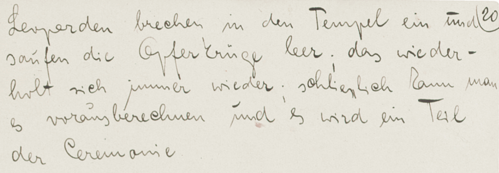 Wenn von Franz Kafka sowohl im 7. (Oxforder) Oktavheft als auch auf dem Zürauer ›Zettel‹ No. 20 zu lesen ist: »Leoparden brechen in den Tempel ein und saufen die Opferkrüge leer; das wiederholt sich immer wieder; schließlich kann man es vorausberechnen und es wird ein Teil der Zeremonie«, wird es noch gut ein Jahr bis zum Ende des Ersten Weltkriegs hin gewesen sein, doch eine noch neu zu fassende Moderne ist nicht mehr abzuweisen. Wenn die Opferkrüge stets aufs Neue und jedesmal unwiderruflich geleert werden, es keine Opfergaben mehr bereitzuhalten gibt, muss man eben die Zeremonie, mit dieser naheliegenderweise: die Götter, wechseln; neu anschreiben. Dabei ist die Probabilität entscheidend. Man hat es schon gewusst: »Die Statistik aber ist eindeutig«, wie Kafka unter dem Namen seines Chefs am 28.3.1914 unversehens in der Bohemia textet. Versicherungstechnisch und mit Wahrscheinlichkeitsrechnungsbedarf von der einen Seite, von der anderen mit Tempo und Kommunikation. An Jesenká schreibt Kafka 1922: »Geschriebene Küsse kommen nicht an ihren Ort, sondern werden von den Gespenstern auf dem Wege ausgetrunken. Durch diese reichliche Nahrung vermehren sie sich ja so unerhört. Die Menschheit fühlt das und kämpft dagegen, sie hat, um möglichst das Gespenstische zwischen den Menschen auszuschalten, und den natürlichen Verkehr, den Frieden der Seelen zu erreichen, die Eisenbahn, das Auto, den Aeroplan erfunden, aber es hilft nichts mehr, es sind offenbar Erfindungen, die schon im Absturz gemacht werden, die Gegenseite ist soviel ruhiger und stärker, sie hat nach der Post den Telegraphen erfunden, das Telephon, die Funkentelegraphie.« Die Elektrizität ist in die Menschheit gefahren wie zuvor nur in den Kleistschen Leichenstein der Gräfin von P…. oder in Nollets Mönche. Es gibt kein zurück, kein dahinter. Nicht einmal die Anwendung von Big Data-Strömen – »Es fällt mir ein:schreib mir auch einmal mit der Mascschine.Da müsste es doch viel mehr werden, als z.B. der letzte Sonntagsgruss/von Freitag und Samstag habe ich noch nichts/vielleicht wird Schreibmaschinenschri[f]t auch schneller zensuriert« (Kafka an Bauer 1916) – übersättigte die Gespenster. Denn die »Gegenseite«, die Leoparden und Gespenster (Vampyre: »Das Kapital ist verstorbene Arbeit, die sich nur vampyrmäßig belebt durch Einsaugung lebendiger Arbeit und um so mehr lebt, je mehr sie davon einsaugt«, heißt’s im Kapital), sind unabweisbar. Sie machen Ceremonien vorausberechenbar, Küsse schreibbar, die Disassembly zur Assembly Line mit Warentrenner. Es kann auch nie genug sein, und so ist’s der Trieb des Kapitals: »sich zu verwerten, Mehrwert zu schaffen, mit seinem konstanten Teil, den Produktionsmitteln, die größtmögliche Masse Mehrarbeit einzusaugen« – Vermehrung ist das Stichwort im Zeitalter der Carbon Copy: »Grammophon und Typewriter, Mimeografie und Lochkarten fielen nicht vom Himmel der technischen Erfindung, sondern wurden vom Fegefeuer des bürokratischen Reproduktionsbedarfs und Rechenaufwands ausgeschwitzt.« (Schüttpelz) Gespenster, Vampire, Leoparden, Bürokratie, Kapital, Medien: »If it be now, ’tis not to come; if it be not to come, it will be now; if it be not now, yet it will come—the readiness is all.« (Hamlet) – »In this matter dates are everything, and I think that if we get all of our material ready, and have every item put in chronological order, we shall have done much.« (Mina Harker, Probabilistin, Typewrider, & Spezialistin für speech-to-text; in einem Schloss mit Anschluss und Schreibmaschinen)